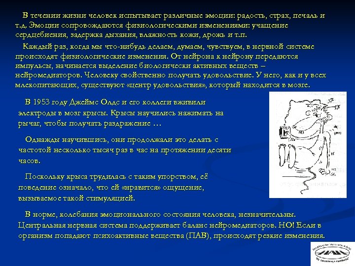 В течении жизни человек испытывает различные эмоции: радость, страх, печаль и т. д. Эмоции сопровождаются физиологическими изменениями: учащение сердцебиения, задержка дыхания, влажность кожи, дрожь и т. п. Каждый раз, когда мы что-нибудь делаем, думаем, чувствуем, в нервной системе происходят физиологические изменения. От нейрона к нейрону передаются импульсы, начинается выделение биологически активных веществ – нейромедиаторов. Человеку свойственно получать удовольствие. У него, как и у всех млекопитающих, существуют «центр удовольствия» , который находится в мозге. В 1953 году Джеймс Олдс и его коллеги вживили электроды в мозг крысы. Крысы научились нажимать на рычаг, чтобы получать раздражение … Однажды научившись, они продолжали это делать с частотой несколько тысяч раз в час на протяжении десяти часов. Поскольку крыса трудилась с таким упорством, её поведение означало, что ей «нравится» ощущение, вызываемое такой стимуляцией. В норме, колебания эмоционального состояния человека, незначительны. Центральная нервная система поддерживает баланс нейромедиаторов. НО! Если в организм попадают психоактивные вещества (ПАВ), происходят резкие изменения.