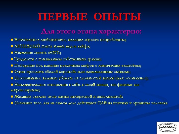 ПЕРВЫЕ ОПЫТЫ Для этого этапа характерно: Естественное любопытство, желание «просто попробовать» ; n АКТИВНЫЙ поиск новых видов кайфа; n Неумение сказать «НЕТ» ; n Трудности с пониманием собственных границ; n Попадание под влияние различных мифов о химических веществах; n Страх прослыть «белой вороной» или «маменькиным сынком» ; n Неосознанное желание убежать от сложностей жизни (или осознанное); n Наплевательское отношение к себе, к своей жизни, « пофигизм» как мировоззрение; n Желание сделать свою жизнь интересной и наполненной; n Незнание того, как на самом деле действуют ПАВ на психику и организм человека. n