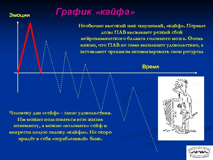 Эмоции График «кайфа» Необычно высокий пик ощущений, «кайф» . Первые дозы ПАВ вызывают резкий сбой нейрохимического баланса головного мозга. Очень важно, что ПАВ не сами вызывают удовольствие, а заставляют организм активизировать свои ресурсы. Время Человеку дан «сейф» - запас удовольствия. Им можно пользоваться всю жизнь понемногу, а можно «взломать» сейф и выгрести целую охапку «кайфа» . Не скоро придёт в себя «ограбленный» банк.