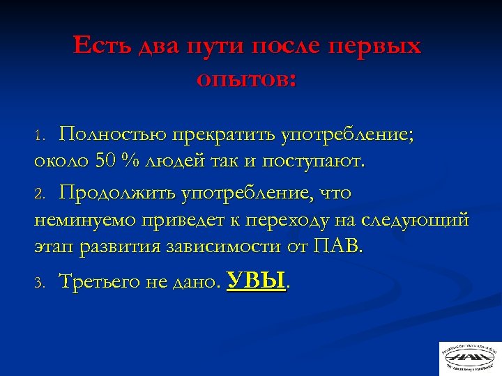 Есть два пути после первых опытов: Полностью прекратить употребление; около 50 % людей так и поступают. 2. Продолжить употребление, что неминуемо приведет к переходу на следующий этап развития зависимости от ПАВ. 1. 3. Третьего не дано. УВЫ.