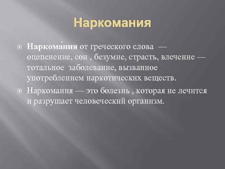 Наркомания Наркома ния от греческого слова — оцепенение, сон , безумие, страсть, влечение — тотальное заболевание, вызванное употреблением наркотических веществ. Наркомания — это болезнь , которая не лечится и разрушает человеческий организм.