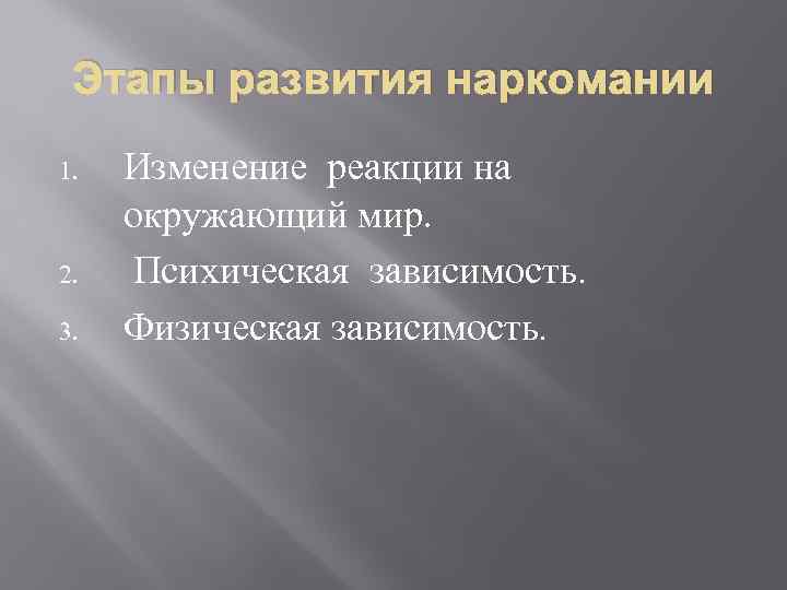 Этапы развития наркомании 1. 2. 3. Изменение реакции на окружающий мир. Психическая зависимость. Физическая зависимость.
