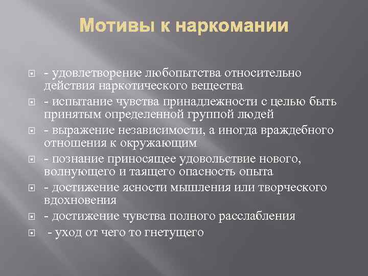 - удовлетворение любопытства относительно действия наркотического вещества - испытание чувства принадлежности с целью быть принятым определенной группой людей - выражение независимости, а иногда враждебного отношения к окружающим - познание приносящее удовольствие нового, волнующего и таящего опасность опыта - достижение ясности мышления или творческого вдохновения - достижение чувства полного расслабления - уход от чего то гнетущего