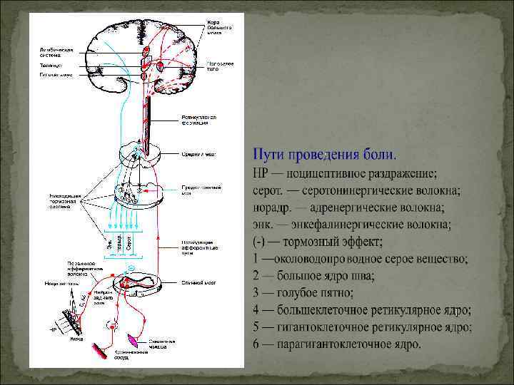 НЕРВНЫЕ ПУТИ МЕДИИРОВАНИЯ БОЛИ И МЕСТА ДЕЙСТВИЯ ОБЕЗБОЛИВАЮЩИХ СРЕДСТВ Кора Опиаты перивентрикулярное серое вещество Ретикулярная формация Продолговатый мозг Таламус Общие анестетики Опиаты Восходящие спинномозговые пути Торакотомия Дорсальный рог спинного мозга Опиаты Чувствительные волокна Ноцицептивные нервные окончания Местные анестетики Аспирин