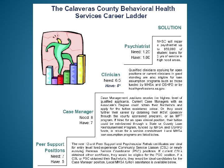 County Workforce Initiatives • Rural MSW Program • Scholarship and Loan Repayment Programs • Career Ladders • Distributed Education • Consumer and Family Member Employment • Mental Health Professional Shortage Area Designation • “Roving” Clinical Supervisors