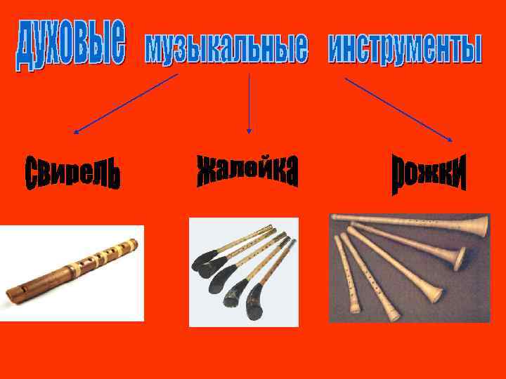 Деревянные духовые народные инструменты: 1. Рожок 2. Дудочка 3. Свирель 4. Жалейка