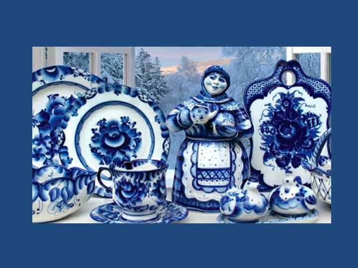 Гжель • Народные художественные промыслы трудно представить без гжели. Раньше это название носило село, расположенное в 50 километрах от Москвы. Там проживали мастера, которые и начали создавать высокохудожественные изделия из фарфора. Их расписывали кобальтом.