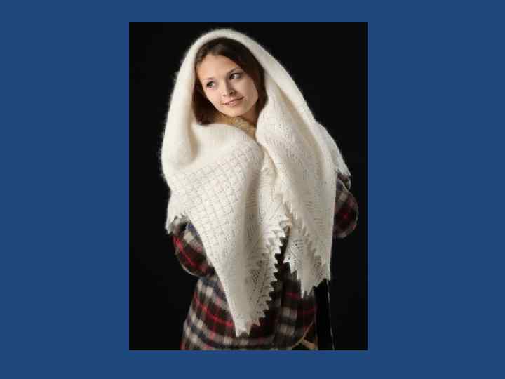 Оренбургские пуховые платки • Вязаный платок из пуха оренбургских коз и основы (х/б, шёлка или др. ). Пуховязальный промысел зародился в Оренбургском крае в XVIII веке. Паутинка и палантин — это очень тонкие, как паутина, платки. Тонкие паутинки имеют, как правило, сложный узор и используются как украшение. Тонкость изделия нередко определяют по 2 параметрам: проходит ли изделие через кольцо и помещается ли в гусином яйце.