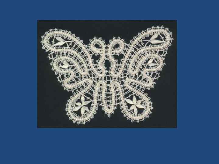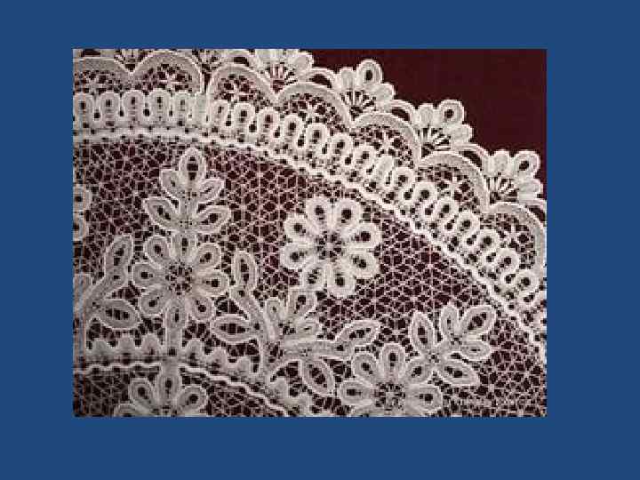 Вологодское и Елецкое кружево • Вологодское кружево - русское кружево, плетёное на коклюшках (деревянных палочках); распространено в Вологодской области с XVI—XVII века. Все основные изображения в сцепном вологодском кружеве выполняются плотной непрерывной, одинаковой по ширине, плавно извивающейся тесьмой, они чётко вырисовываются на фоне узорных решёток, украшенных насновками в виде звёздочек и розеток.