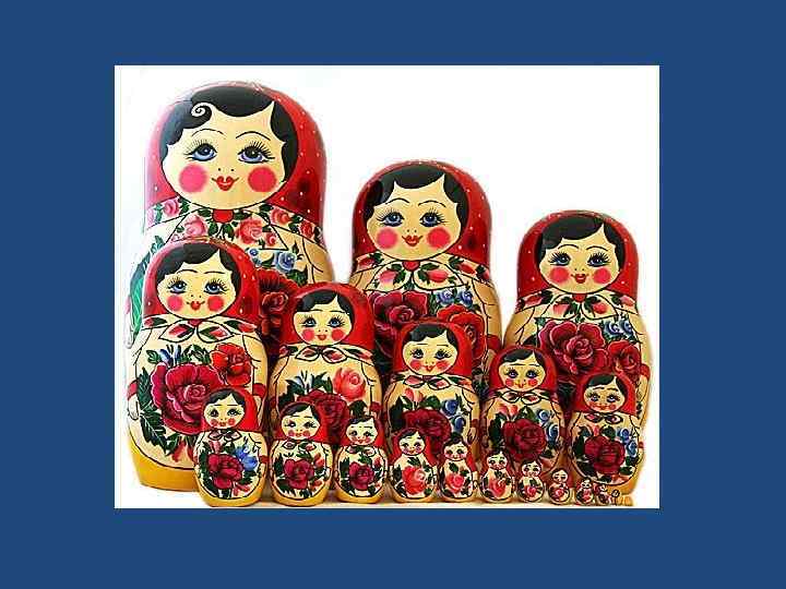 Матрёшка • Русская деревянная игрушка в виде расписной полой куклы, внутри которой находятся подобные ей куклы меньшего размера. По традиции рисуется женщина в красном сарафане и желтом платке. В последнее время возможный диапазон тем росписи ничем не ограничен, начиная от сказочных персонажей и кончая советскими лидерами.