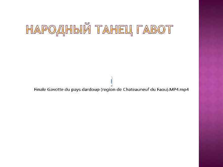 Гаво т (фр. Gavotte), означает буквально — танец гавотов, жителей области Овернь во Франции — французский танец. Первоначально возник как быстрый народный танец-цепочка. В 18 веке был введён Жаном Батистом Люлли в репертуар придворной и салонной музыки. В русской музыке форма гавота использовалась в произведениях П. И. Чайковского, и особенно - С. С. Прокофьева (в симфонической, фортепианной музыке, балетах).