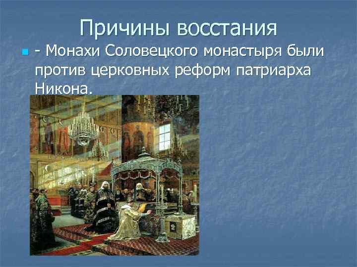 Причины восстания n - Монахи Соловецкого монастыря были против церковных реформ патриарха Никона.