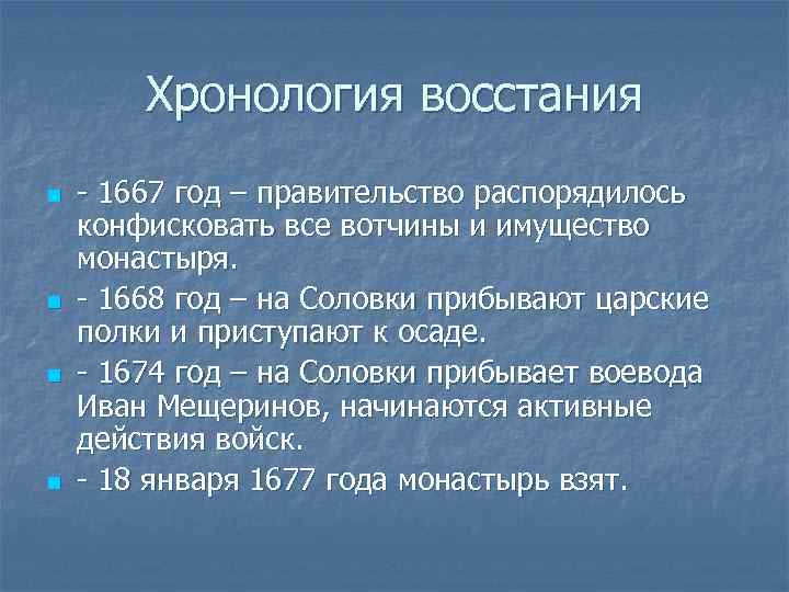 Хронология восстания n n - 1667 год – правительство распорядилось конфисковать все вотчины и имущество монастыря. - 1668 год – на Соловки прибывают царские полки и приступают к осаде. - 1674 год – на Соловки прибывает воевода Иван Мещеринов, начинаются активные действия войск. - 18 января 1677 года монастырь взят.