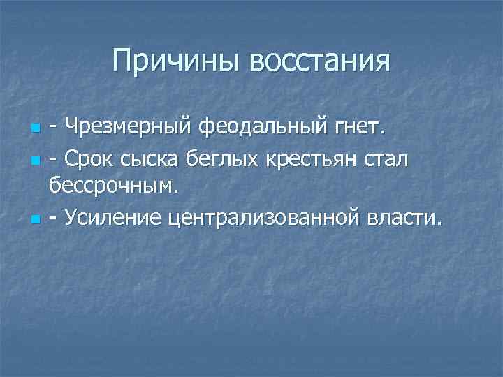 Причины восстания n n n - Чрезмерный феодальный гнет. - Срок сыска беглых крестьян стал бессрочным. - Усиление централизованной власти.