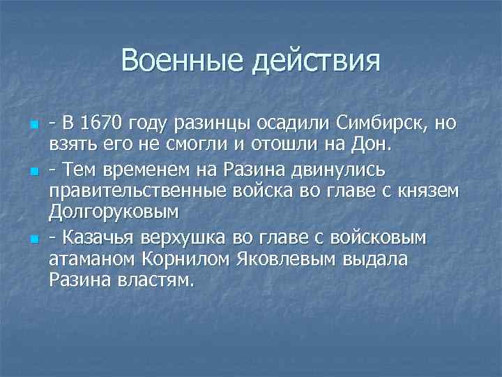 Военные действия n n n - В 1670 году разинцы осадили Симбирск, но взять его не смогли и отошли на Дон. - Тем временем на Разина двинулись правительственные войска во главе с князем Долгоруковым - Казачья верхушка во главе с войсковым атаманом Корнилом Яковлевым выдала Разина властям.