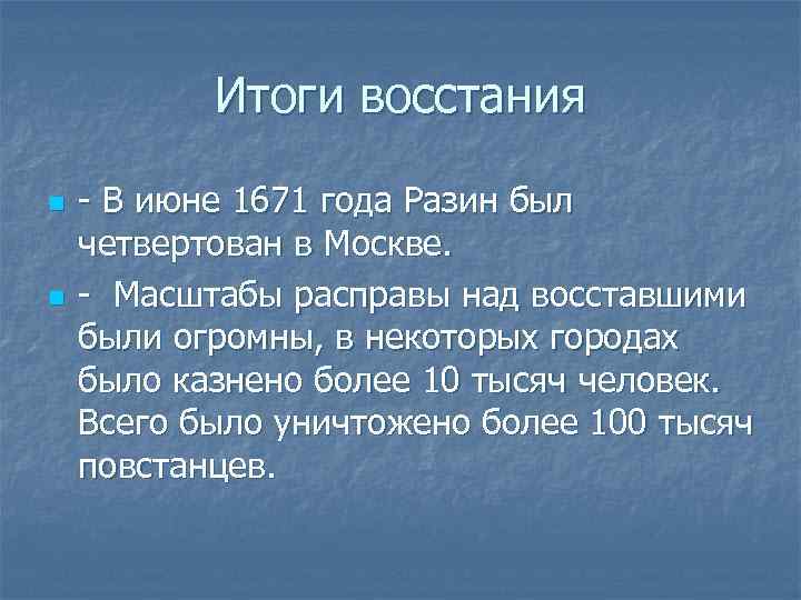 Итоги восстания n n - В июне 1671 года Разин был четвертован в Москве. - Масштабы расправы над восставшими были огромны, в некоторых городах было казнено более 10 тысяч человек. Всего было уничтожено более 100 тысяч повстанцев.