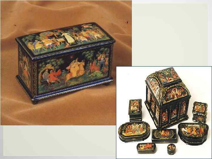 Палехская миниатюра — народный промысел, развившийся в поселке Палех Ивановской области. Лаковая миниатюра исполняется темперой на папье-маше. Обычно расписываются шкатулки, ларцы, кубышки, брошки, панно, пепельницы, заколки для галстука, игольницы и т. д. Посёлок Палех. Шкатулка, 1934 год. И. М. Баканов.