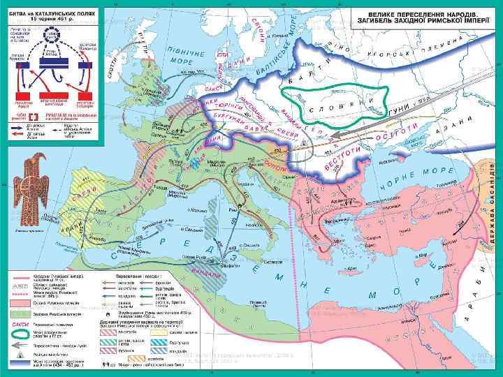 395 р. – Римська імперія розколюється на Західну та Східну. 476 р. – падіння Західної Римської імперії під натиском варварів.