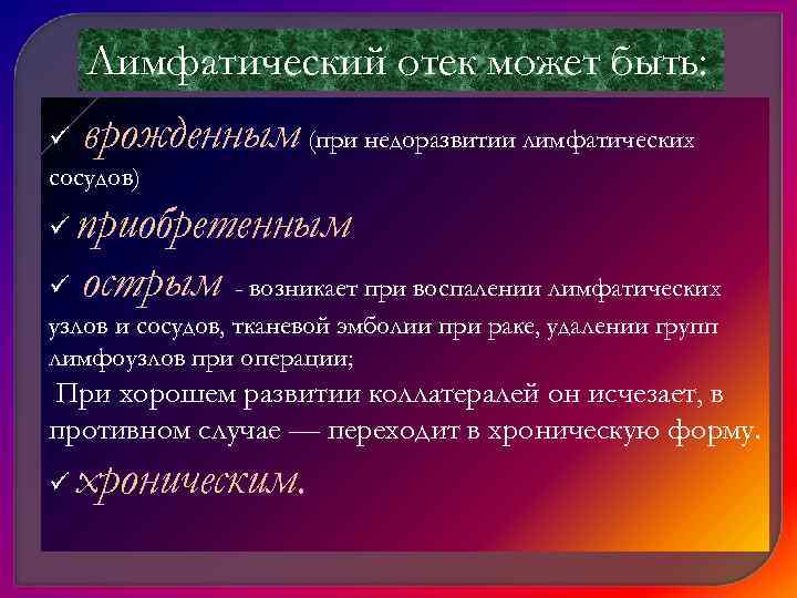 Лимфатический отек может быть: ü врожденным (при недоразвитии лимфатических сосудов) üприобретенным ü острым - возникает при воспалении лимфатических узлов и сосудов, тканевой эмболии при раке, удалении групп лимфоузлов при операции; При хорошем развитии коллатералей он исчезает, в противном случае — переходит в хроническую форму. ü хроническим.