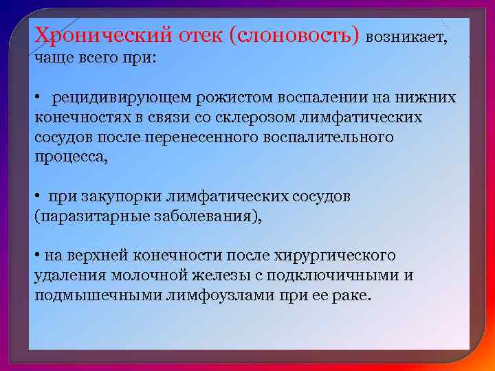 Хронический отек (слоновость) возникает, чаще всего при: • рецидивирующем рожистом воспалении на нижних конечностях в связи со склерозом лимфатических сосудов после перенесенного воспалительного процесса, • при закупорки лимфатических сосудов (паразитарные заболевания), • на верхней конечности после хирургического удаления молочной железы с подключичными и подмышечными лимфоузлами при ее раке.