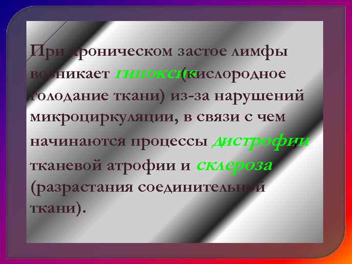 При хроническом застое лимфы возникает гипоксия(кислородное голодание ткани) из-за нарушений микроциркуляции, в связи с чем начинаются процессы дистрофии , тканевой атрофии и склероза (разрастания соединительной ткани).