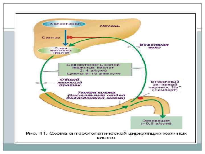Гепатоциты вырабатывают холевую и хенодезоксихолевую кислоты- первичные желчные кислоты. Под влиянием бактерий тонкой кишки они модифицируются во вторичные желчные кислоты. Желчные кислоты реабсорбируются в тонкой кишке и попадают в систему воротной вены для рециркуляции. При поступлении в печень по механизму отрицательной обратной связи они угнетают синтез новых желчных кислот.