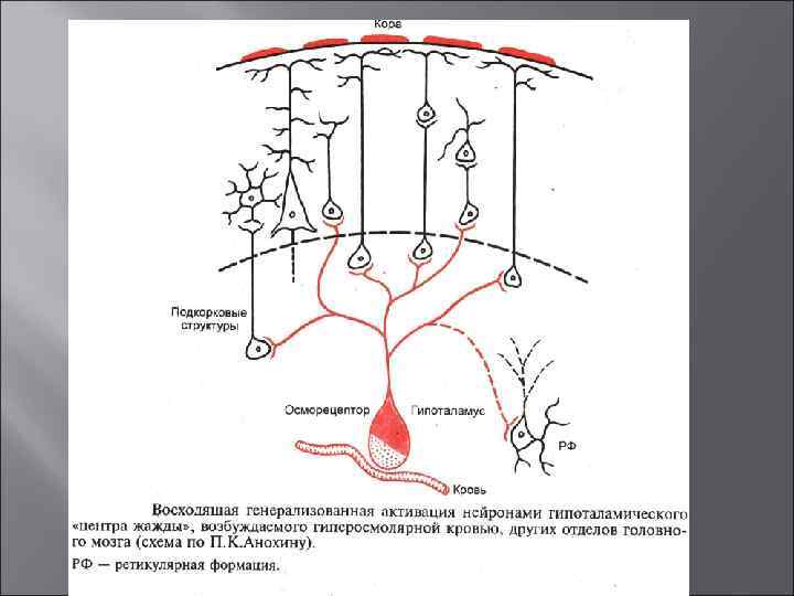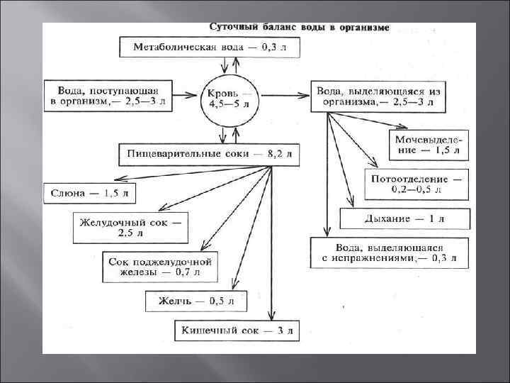Источники поступления воды: 1200 мл воды питьевой + 1000 мл воды в составе пищи + 300 мл оксидационная вода 2500 за сутки q Пути выделения: Поступление = выделение 1400 мл моча + 600 мл пот + 200 мл кал + 300 мл выдыхаемая жидкость 2500 мл за сутки q