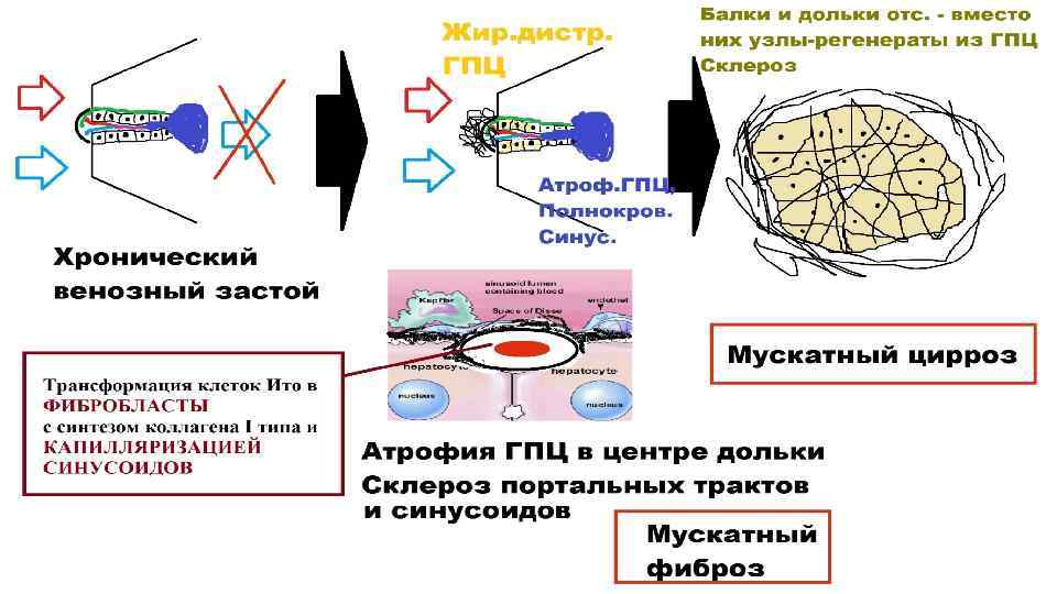 Основные характеристики капиллярнопаренхиматозного блока • Капиллярно-паренхиматозный блок – это результат склероза ткани при хроническом венозном полнокровии органа • Склероз, захватывая, околососудистые пространства (например, пространства Диссе), приводит к неэффективности транскапиллярного обмена