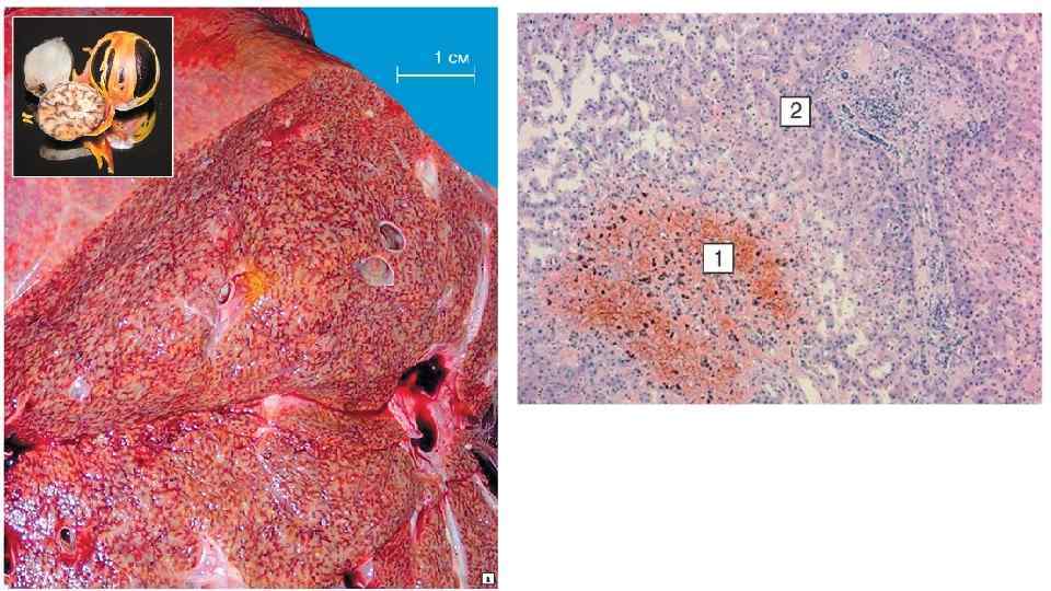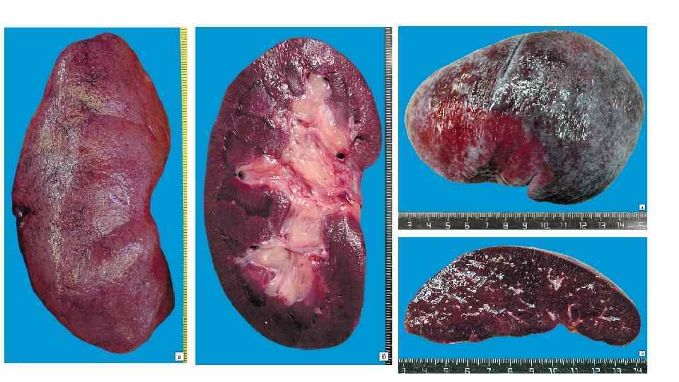 Хроническое венозное полнокровие (большой круг) – некоторые примеры • Мускатная печень (вплоть до мускатного фиброза и цирроза): • мускатный рисунок (жировая дистрофия периферии балок + скопления эритроцитов в центральных отделах) обусловлен исключительно типом кровоснабжения печени и лимфооттоком от ее тканей (см. крово- и лимфообращение в печени (учебник Гайтона)). • Наименее оксигенированная кровь в центральных отделах приводит к атрофии балок, а скопления эритроцитов связаны с длительным застоем (плазма уходит через печеночную лимфу). • Последующие склеротические изменения в пространствах Диссе и портальных трактах приводят к ухудшению кровотока через печень: повышение сопротивления току крови → давления в портальной вене → портальная гипертезния (хроническое венозное полнокровие селезенки и других непарных органов брюшной полости) и образованию асцита. • Цианоз (восстановленный гемоглобин) • Кожных покровов • Внутренних органов (+ индурация (уплотнение; причина - склероз)): • селезенки (результат портальной гипертензии) • почек (результат системной венозной недостаточности)