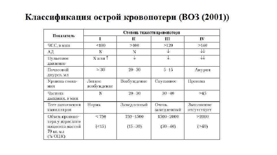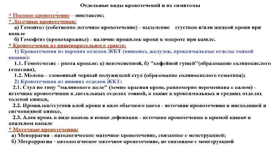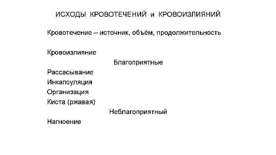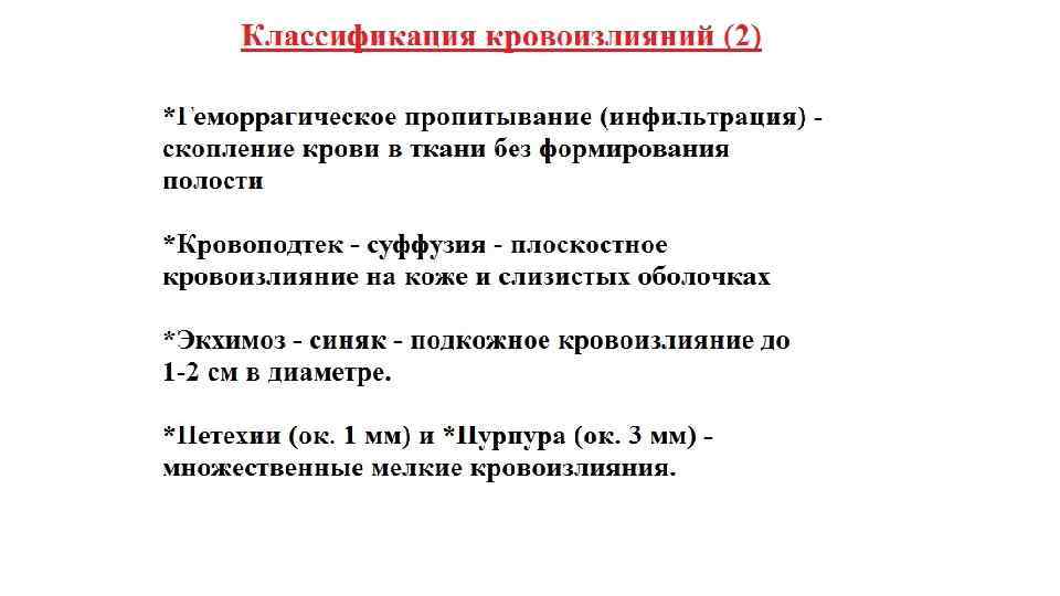 Нарушения проницаемости сосудистой стенки. Кровотечение. • Кровотечение – это выход крови из кровеносных сосудов или полостей сердца: • Во внешнюю среду – наружное кровотечение (в т. ч. гематурия) • В естественные анатомические полости – внутреннее кровотечение (гемартроз, гемоперикард (тампонада кровью полости перикарда), гемоперитонеум, гемоторакс) • В ткань с развитием кровоизлияний • Классификация: • По источнику: сердечные, артериальные, капиллярные, паренхиматозные (похожи на капиллярные, но из размозженных тканей, трудно остановить), венозные, смешанные • По направлению истечения крови: наружные, внутренние • По скорости развития: острые/хронические