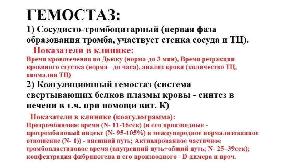 Механизмы и типы кровоточивости Механизмы кровоточивости: • Разрыв (сосуда, сердца) • Разъедание стенки (ферменты желудочного сока, опухоли и др. ) • Диапедез ( «пропотевание» эритроцитов через стенку сосуда, структурные изменения которой не выражены) Типы кровоточивости: 1. Петехиально-синячковый (связан с нарушением образования тромбоцитарного тромба, который останавливает кровь только в мелких сосудов → кровоточивость из мелких сосудов) 2. Гематомный (связан с нарушением образования фибрина, который укрепляет тромбоцитарный тромб в крупных сосудах → кровоточивость из крупных и средних сосудов) 3. Смешанный (совместные нарушения вышеперечисленных механизмов) (1+2) 4. Васкулитно-пурпурный (васкулит→ повреждение эндотелия → повышение сосудистой проницаемости → диапедез эритроцитов → пурпура) 5. Ангиоматозный (наследственные дефекты сосудистой стенки (болезнь Рандю. Ослера), приводящие к спонтанным разрывам)
