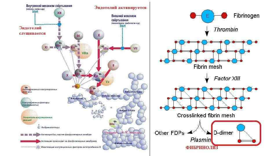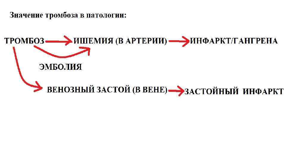 Исходы тромбоза • Благоприятные: • Контракция тромба (сжатие за счет сокращения фибрина), сократительных белков тромбоцитов), ретракция тромба (сжатие и отход от стенки сосуда • Аспетический лизис (за счет системы фибринолиза) с формированием каналов (канализация) вплоть до полной реканализации просвета (как правило, в венах) • Прорастание соединительной тканью (организация) • Прорастание эндотелием (васкуляризация) • Инкорпорация (встраивание) в стенку кровеносного сосуда • Кальцификация (дистрофическое обызвествление) и оссификация (редко) • Неблагоприяные: • Эмболия (например, хвост смешанного тромба) • Септический (микробный) лизис с образованием септического эмбола
