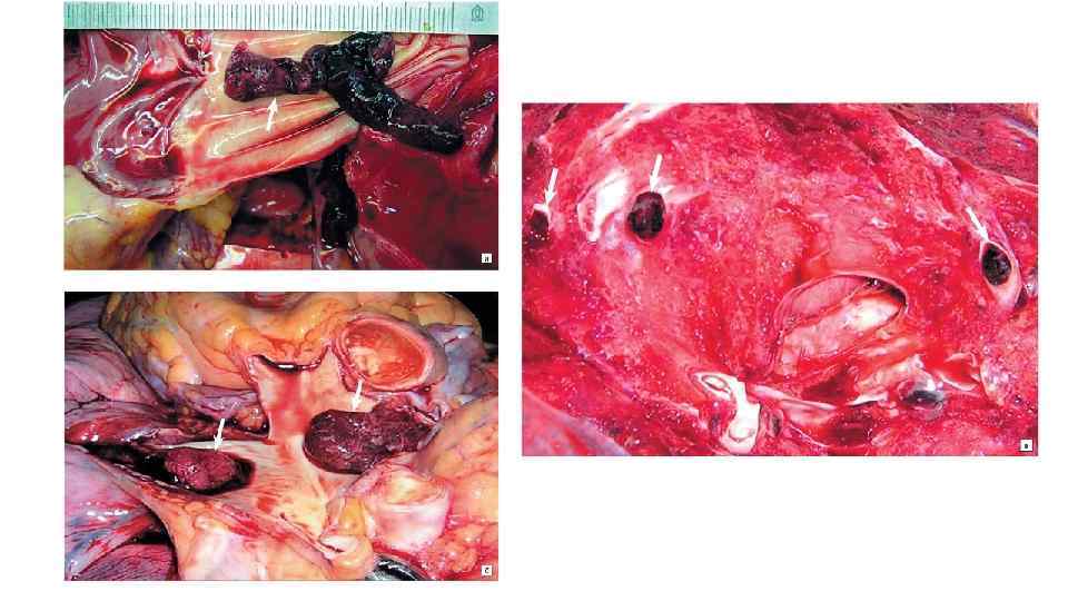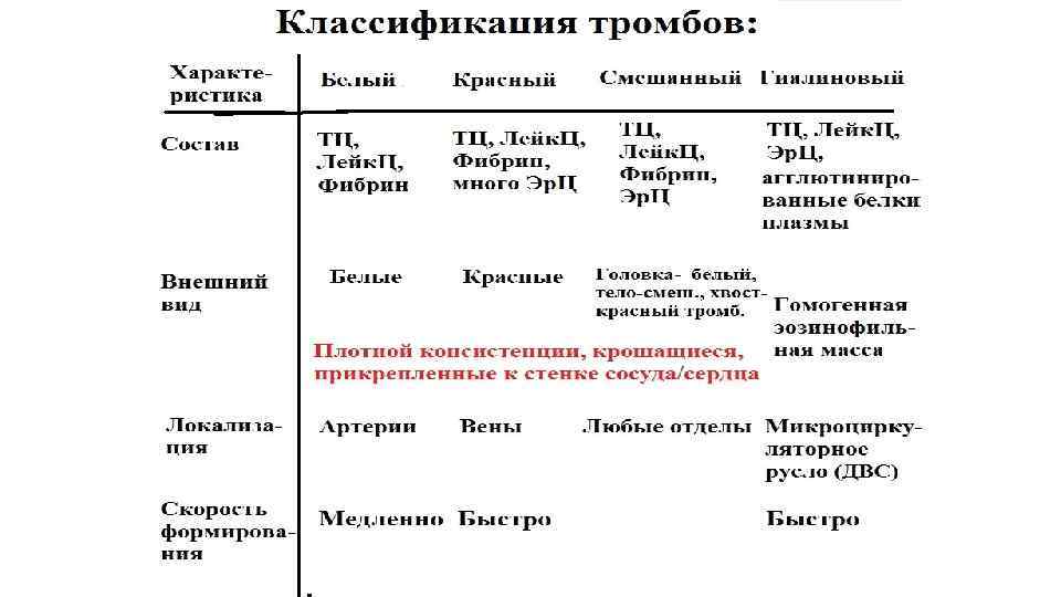 Отличия тромбов от посмертных сгустков Признак Тромб, тромбоэмбол Посмертный сгусток Консистенция Плотная (контракция тромботических масс в живом организме) Дряблая Поверхность Тусклая, гофрированная Гладкая т. к. соответствует форме (шероховатая за счет новых сосуда порций тромбоцитов и фибрина в условиях движения крови) Прикрепление к стенке сосуда Прикреплен (тромбоэмбол не прикреплен) Не прикреплен