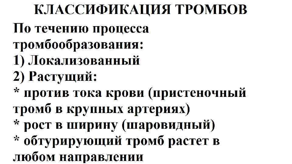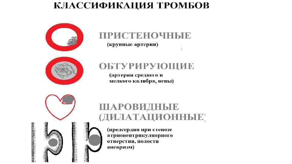 Классификация тромбов. Особые виды тромбов • Марантические (общее истощение, обезвоживание) • Опухолевые • Микробные (септические) • Дилатационные (шаровидные) • Тромбы-наездники (тромб образовывается на тромбоэмболе) и др.