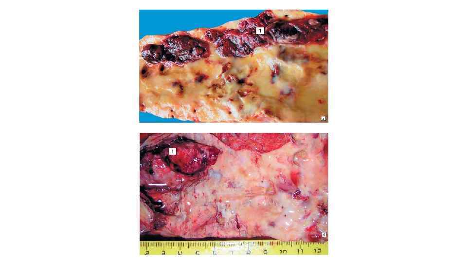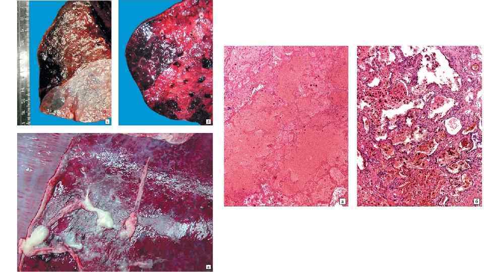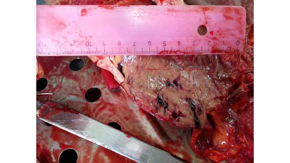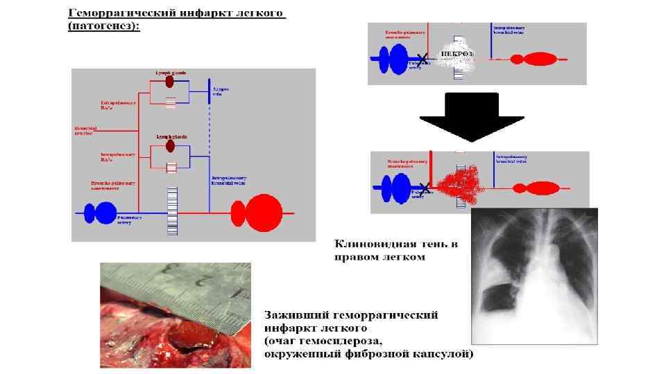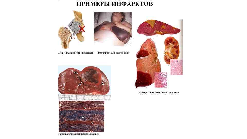 Острое венозное полнокровие внутренних органов - некоторые примеры Большой круг • Почки – активация шунта Труэта: сброс крови через юкстамедуллярные нефроны, бледная кора, синюшные полнокровные пирамиды, некротический нефроз • Печень – центролобулярные некрозы (некрозы в центрах долек – наиболее чувствительных к гипоксии отделах – см. кровообращение в печеночных дольках) • Легкие – отек легких ТОЛЬКО ПРИ ЛЕВОЖЕЛУДОЧКОВОЙ СЕРДЕЧНОЙ НЕДОСТАТОЧНОСТИ (лимфогенный фактор, связанный с высоким ЦВД способствует плохой резорбции профильтровавшейся в легочный интерстиций жидкости) Малый круг • Легкие – кровоизлияния под плевру, отек легких (сначала интерстициальный, затем альвеолярный). Патогенез отека связан с гидродинамическим фактором