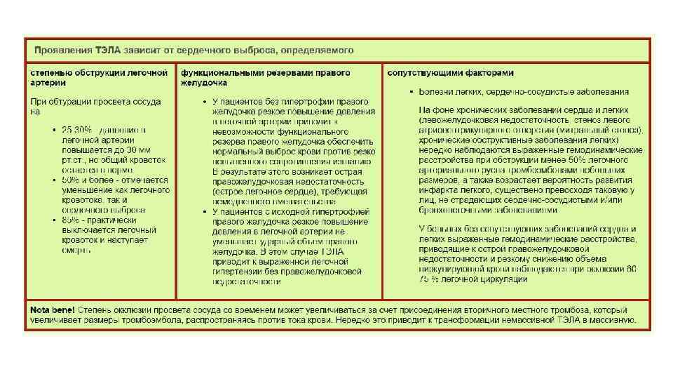 Эмболия • Это циркуляция в кровотоке или лимфе, не встречающихся в норме веществ Классификация: • По типу эмболов: • Тромбоэмболия (фрагменты тромба) • Жировая эмболия (в/в инъекции масляных р-ров, размозжение жировой клетчатки в т. ч. ККМ) • Воздушная (попадание воздуха в зияющие вены матки (во время родов из-за высокого внутриматочного давления при зияющих венах плацентарного ложа поврежденной плаценты), подключичные вены, при травмах склерозированного легкого…, в/в инъекции): • До 100 мл – рассасывание • 100 -300 мл – дыхательная недостаточность • Более 300 - смерть • Газовая: • Кессонная болезнь (острая/хроническая) – образование пузырьков азота из растворенного в крови при декомпрессии • Газовая гангрена – образование пузырьков газа в замкнутых фасциальных футлярах под большим давлением с выходом в кровь • Тканевая/клеточная (гематогенные/лимфогенные метастазы злокачественных опухолей) • Околоплодными водами (во время родов из-за высокого внутриматочного давления при зияющих венах плацентарного ложа поврежденной плаценты) с развитием ДВС • Микробная (септическая) и паразитарная эмболии • Инородными телами (в т. ч. частицами разрушенной бляшки) • По направлению движения: • По физиологическому току жидкости – ортоградная • Против физиологического тока жидкости – ретроградная (метастаз Вирхова) • Парадоксальная – с переходом из одного круга кровообращения в другой (врожденные пороки сердца)