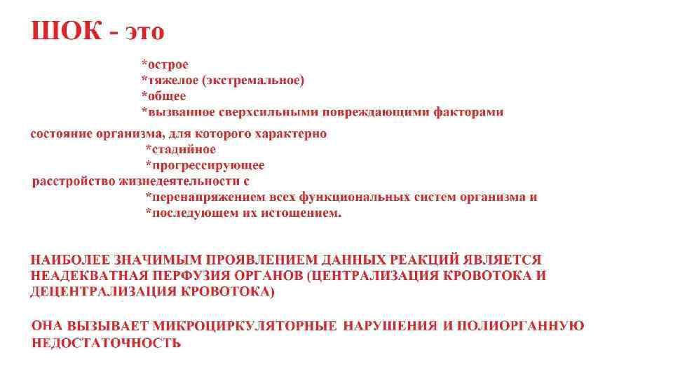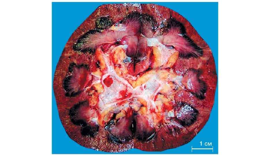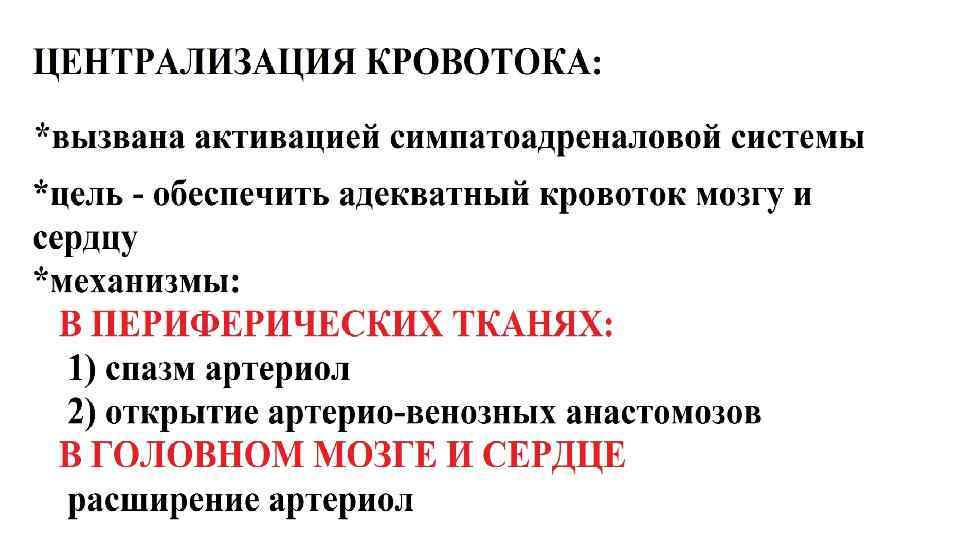 Проявления централизации кровотока в почке – «шоковая» почка • Падение системного артериального давления • Снижение фильтрации первичной мочи, повышение реабсорбции в извитых канальцах • Перераспределение кровотока: • Открытие сосудов околомозговых (юкстамедуллярных) нефронов с транзитом крови через их клубочки БЕЗ ФИЛЬТРАЦИИ (диаметр выносящей артериолы не меньше, чем приносящей) мочи. Сброс всей крови через сосуды пирамид (покраснение пирамид с появлением подчеркнуто выраженной границы с корой) • Малокровие коркового вещества (побледнение) с последующим некрозом извитых канальцев нефрона поскольку они: • Кровоснабжаются из коры • Активно потребляют энергию • Цель этих реакций – всеми возможными средствами поднять (или сохранить) оптимальный уровень АД.