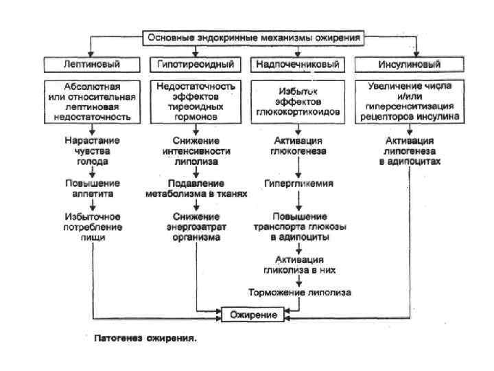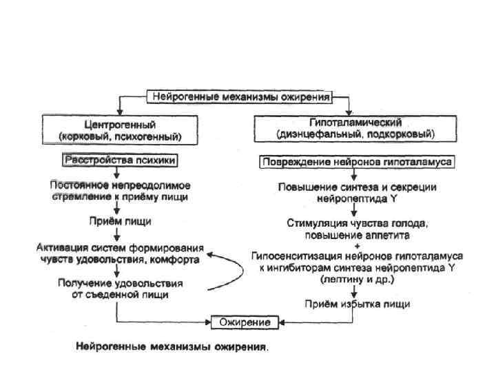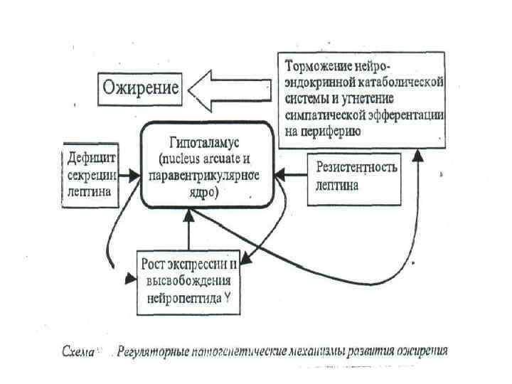 • Повреждение вентромедиального гипоталамуса ведет к развитию синдрома гипоталамического ожирения. Он характеризуется: усиленным потреблением пищи, ростом секреции инсулина, снижением двигательной активности, эмоциональной неустойчивостью. • Ожирение может быть результатом расстройств нейроэндокринной регуляции. Установлено, что мутация гена ожирения обусловливает дефицит фактора анорексии, циркулирующего с кровью. • Этот ген кодирует полипептидный гормон, названный лептином. Он синтезируется в жировых клетках и секретируется в кровь. Лептин — это гуморальный переносчик обратной афферентации в системе удержания массы жира в организме на одном уровне. • Ожирение может быть следствием или дефицита экспрессии гена лептина, или резистентности лептина (недостаточной реакции клеток-мишеней).