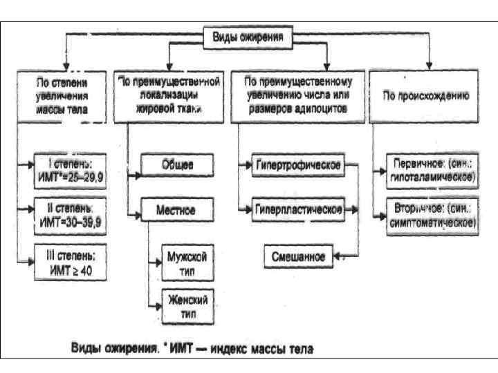 Типы ожирения • Андроидный тип, чаще у мужчин, жир аккумулируется в основном в жировых клетках туловища (жировые подушки в области живота, в подмышечной области и т. д. ) и сальника. У женщин с андроидным типом ожирения существует прямая связь между массой тела и концентрацией андрогенов в крови. Показатель накопления жира в адипоцитах туловища и висцеральных жировых клетках → отношение длины окружности талии к длине окружности нижней конечности в области верхней трети бедра. При андроидном ожирении оно растет. Велика вероятность сахарного диабета, гиперлипидемии, АГ. • При гиноидном ожирении (чаще свойственно женщинам) жир откладывается в нижней части живота и на бедрах. Риск атеросклероза меньше, чем при андроидном. • Висцеральное ожирение это фактор риска наиболее частых болезней человека. Мобилизация свободных жирных кислот при патогенном стрессе происходит в основном через липолиз в висцеральных адипоцитах. Это патогенно действует на печень. Возникают гипергликемия, дислипидемия и гиперинсулинемия.