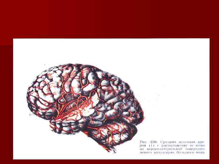 Кровоснабжение головного мозга Внутренняя сонная артерия (a. carotis interna) n Глазничная артерия n Передняя мозговая артерия (a. cerebri anterior) n Средняя мозговая артерия (a. cerebri media ) Позвоночная артерия n Передняя и задняя спинномозговая артерия, задняя нижняя мозжечковая артерия n Базиллярная артерия – передняя нижняя мозжечковая артерия, артерия лабиринта, артерии моста, верхняя мозжечковая артерия n Задняя мозговая артерия (a. cerebri posterior)
