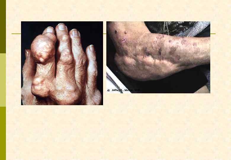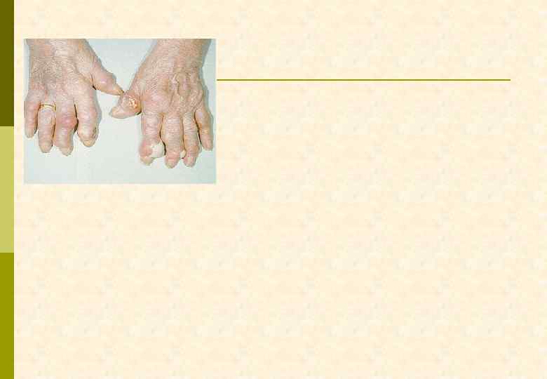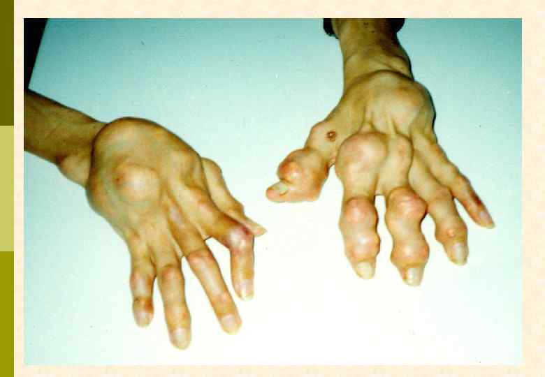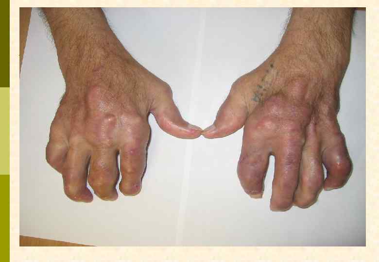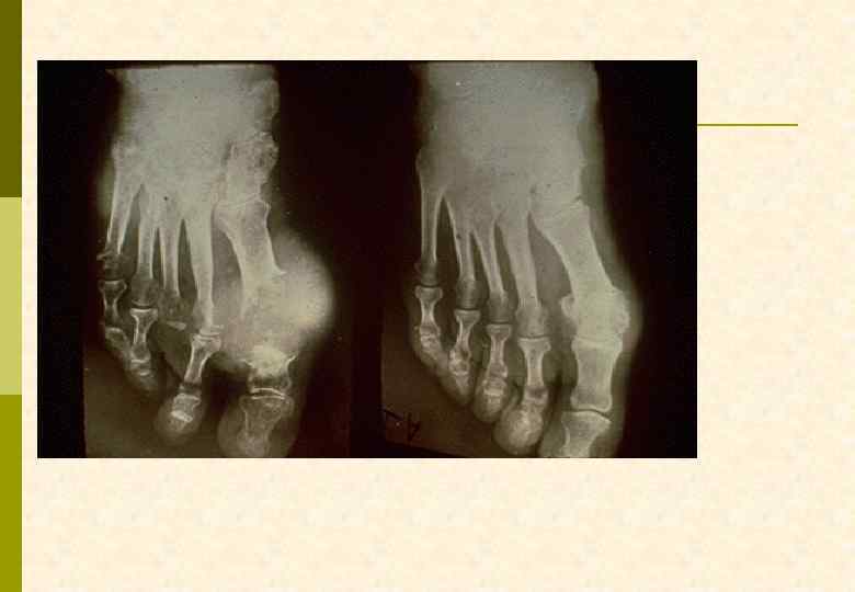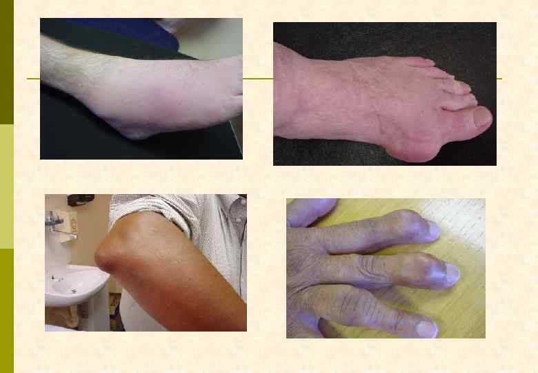 КРИТЕРИИ ДИАГНОЗА ПОДАГРЫ p Абсолютный – обнаружение кристаллов урата натрия в синовиальной жидкости или тканях p Относительные G типичный артрит 1 -го плюснефалангового сустава G два типичных криза других суставов G гиперурикемия, превышающая норму на 2 мг% G наличие тофусов G положительный тест с колхицином