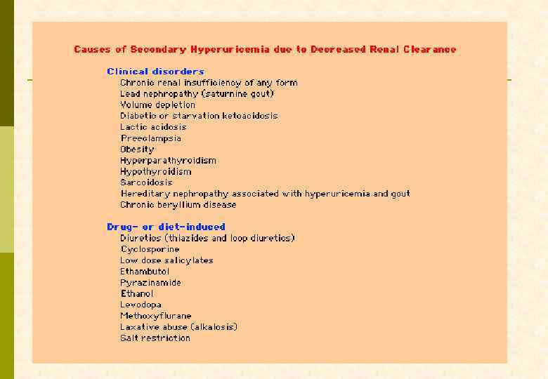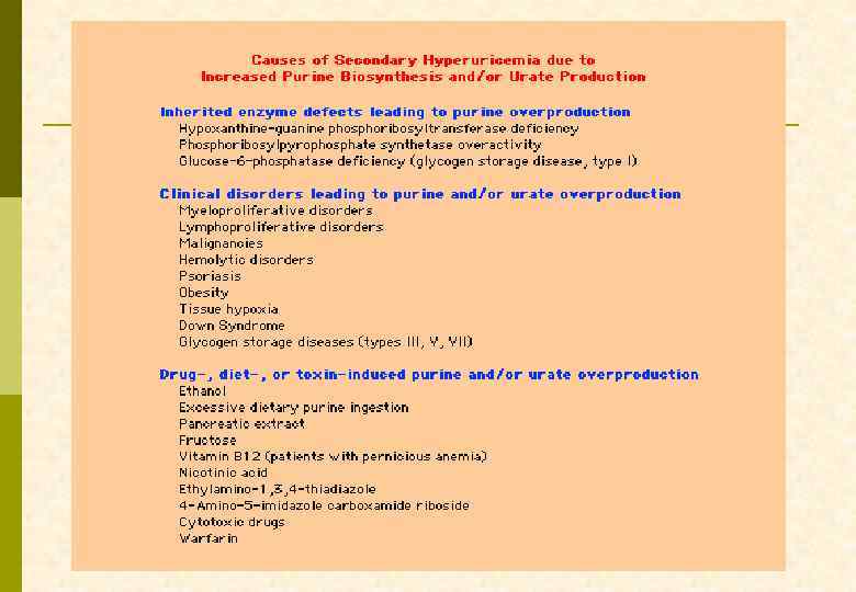 КЛАССИФИКАЦИЯ ГИПЕРУРИКЕМИИ (ПОДАГРЫ) Гиперпродукция мочевой кислоты (10 – 25%) p p Снижение выделения мочевой кислоты с мочой (75 – 90%) Первичная p Первичная n дефицит гипоксантин: гуанинn уменьшение фильтрационной загрузки фосфорибозилтрансферазы n увеличение канальцевой реабсорбции n высокая активность фосфоn уменьшение канальцевой секреции рибозилпирофосфатсинтетазы p Вторичная n идиопатическая n уменьшение функционирующей массы Вторичная почек (хронические болезни почек) n увеличение деградации АТФ n уменьшение канальцевой реабсорбции p дефицит глюкозо-6 -фосфатазы (снижение внеклеточного объема дегидратация, диуретики) p гипоксия тканей n снижение канальцевой секреции (голодание, n увеличение обмена нуклеиновых диабетический кетоацидоз, кислот гиперлактацидемия) p заболевания крови, опухоли, n свинцовая нефропатия псориаз, саркоидоз n лекарственная (пиразинамид, малые дозы n избыточное поступление пуринов с салицилатов, этамбутол, диуретики, L-DOPA, пищей никотиновая кислота, циклоспорин)