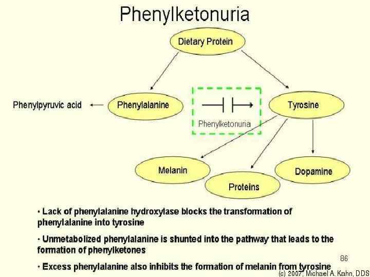 Нарушение обмена АК аутос. -рецесс. с ↑ в крови и моче II. с ↑ в мочи III. нарушение транспорта Большая часть АК внутри клеток, значит. концентр. в гол. мозге. ФКУ- ↓ ФА гидроксидазы → нарушение гидроксилирования ФА → <тирозина n >ФА до 4 мг% Умст. отсталость, судороги у25%, аллергическая сыпь, немотивированные вспышки гнева. I.
