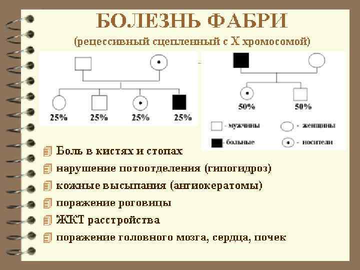 Болезнь Фабри n Женщины –носители, но м. б. клинические проявления. Накопление гликосфинголипидов (полисахариды и липиды) в эндотелиоцитах. С-мы заболевания с 10 лет в среднем. Смерть от инсультов, инфарктов, ХПН.