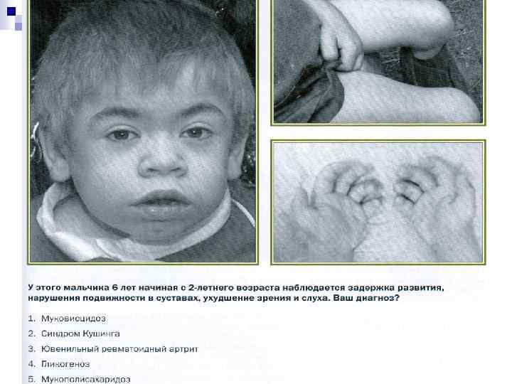Мукополисахаридоз (МПС) Задержка умственного развития u Грубые черты лица u Дизостоз u ↑ печени, селезенки u Нарушение сердечно-сосудистой системы u поражение глаз u глухота u продолжительность жизни 5 -50 лет u ↑ ГАГ в моче u