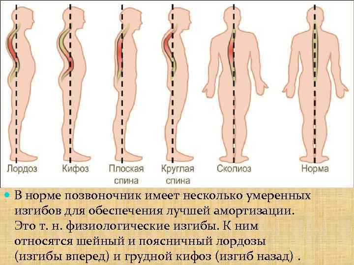 В норме позвоночник имеет несколько умеренных изгибов для обеспечения лучшей амортизации. Это т. н. физиологические изгибы. К ним относятся шейный и поясничный лордозы (изгибы вперед) и грудной кифоз (изгиб назад).