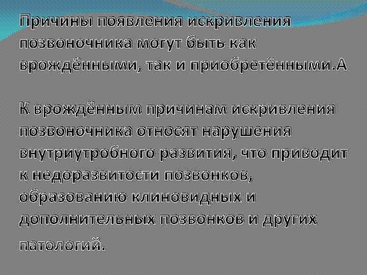 Причины появления искривления позвоночника могут быть как врождёнными, так и приобретёнными. К врождённым причинам искривления позвоночника относят нарушения внутриутробного развития, что приводит к недоразвитости позвонков, образованию клиновидных и дополнительных позвонков и других патологий.