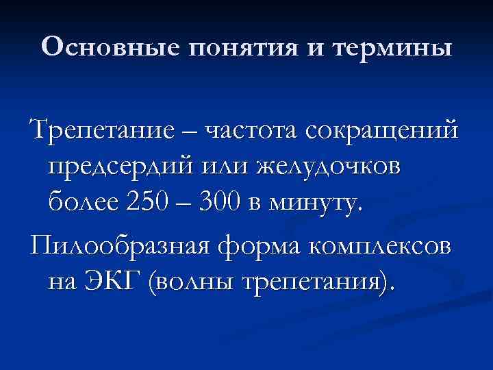 Основные понятия и термины Трепетание – частота сокращений предсердий или желудочков более 250 – 300 в минуту. Пилообразная форма комплексов на ЭКГ (волны трепетания).