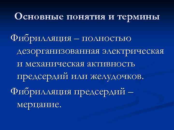 Основные понятия и термины Фибрилляция – полностью дезорганизованная электрическая и механическая активность предсердий или желудочков. Фибрилляция предсердий – мерцание.