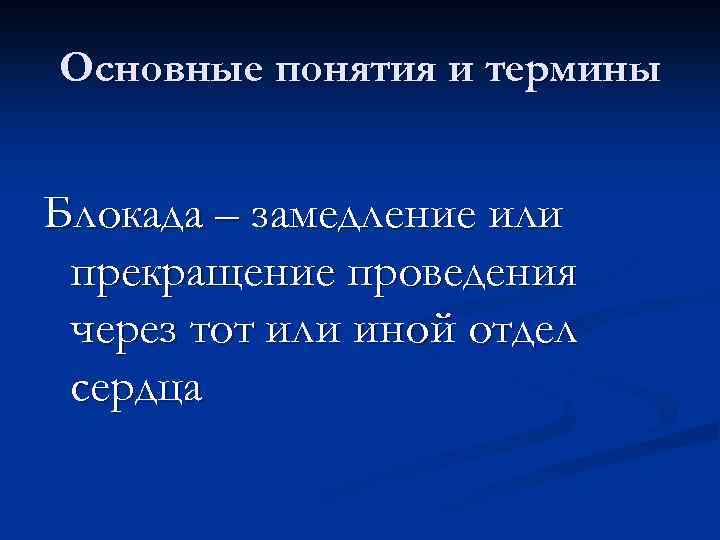 Основные понятия и термины Блокада – замедление или прекращение проведения через тот или иной отдел сердца